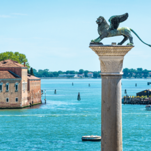 Trên con đường tiến gần đến công trường Marcô, du khách nhìn thấy một con sư tử có đôi cánh đứng sừng sững trên một ngọn tháp cao.  Hình sư tử này nhắc đến sự nghiệp viết sách Phúc Âm đầu tiên của thánh Marcô, như chứng từ của sử gia Papias, sinh sống vào cuối thế kỷ thứ hai viết như sau: